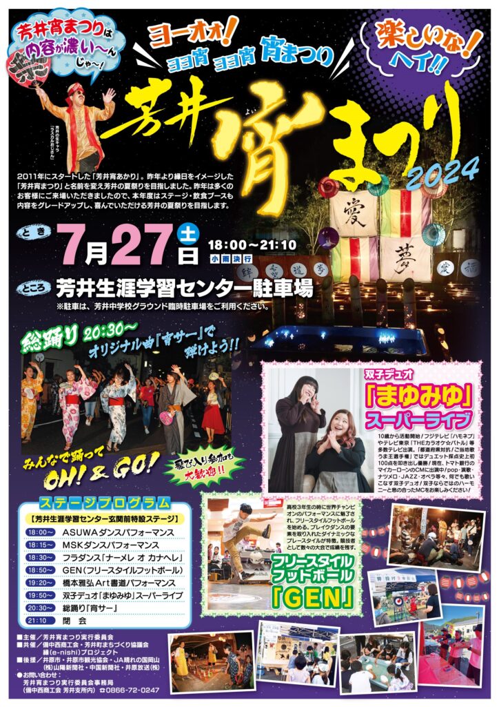 商工会からのお知らせ 芳井宵まつり2024開催のお知らせ 2024.7.8|イベント 令和6年7月27日(土)18:00から芳井生涯学習センター駐車場にて芳井宵まつり2024を開催いたします。ステージイベントの内容等詳しくは下記のチラシをご確認ください。 芳井宵まつりチラシ 投稿ナビゲーション 前の記事へ次の記事へ 2024年7月 月 火 水 木 金 土 日 1234567 891011121314 15161718192021 22232425262728 293031 « 6月 8月 » 最近の投稿 ウェルビーイング経営 ロゴデザイン募集 第50回矢掛の宿場まつり大名行列 第39回芳井ふるさと祭り開催のお知らせ 井原市ウェルビーイング経営認定申請者募集(令和7年11月末締切) 令和7年度「創業塾」受講者募集 アーカイブ 2025年11月 2025年10月 2025年8月 2025年7月 2025年4月 2025年3月 2024年12月 2024年11月 2024年10月 2024年9月 2024年8月 2024年7月 2024年6月 2024年5月 2024年4月 2024年3月 カテゴリー セミナー イベント 補助金 その他 未分類